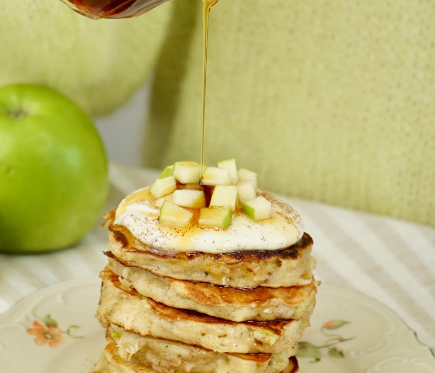 Obuoliais skaninti jogurtiniai blynai yra putlūs, drėgni ir kvapnūs, primenantys obuolių pyragą, bet ne per saldūs, su malonia obuoline rūgštele ir aromatu.
