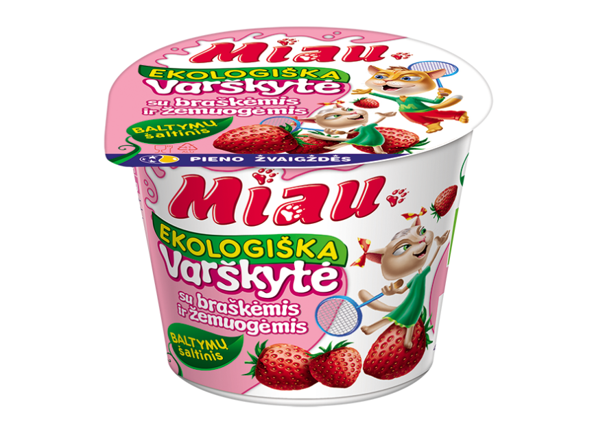 „Miau“ ekologiška varškytė su braškėmis ir žemuogėmis – tai švelnus, purus ir kreminis varškės desertas, kuris tiesiog tirpsta burnoje! Ekologiška varškytė, su saulėje sunokusių braškių ir žemuogių priedu, sukuria malonumą kiekviename kąsnelyje. Kiekvienos pakuotės vidinėje pusėje rasite jums paruoštą staigmeną – užduotėlę, tad šis užkandis ne tik pasotins, bet ir paskatins pramankštinti galvą!